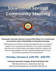 Colorado Attorney General Phil Weiser is discussing affordability in Steamboat Springs Monday, including housing and childcare. He’ll be in Bristol Hall Room 204 at CMC in Steamboat Springs at 4 p.m. tonight (Monday, Jan. 5).