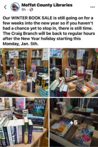 The Craig branch of the Moffat County Library is having a winter book sale. The library is back is back to regular hours today, after the holidays. Hours today and tomorrow are noon to 6 p.m. for the Craig branch.