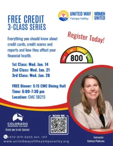 United Way is hosting a Free Credit 3-Class Series. It’s everything you need to know about credit cards, credit scores and reports and how it all affects your financial health. It starts with a free dinner at 5:15 at the CMC Dining Hall. The class is at 6 p.m. in CMC SB215. Find out more at www.UnitedWayoftheYampaValley.org