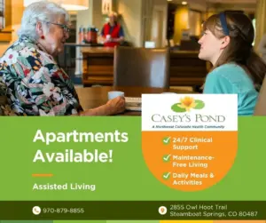 Casey’s Pond Senior Living in Steamboat Springs has apartments available in the Assisted Living community, after many months of a waitlist. Call Casey’s Pond for more information at 970-879-8855, or fill out the Contact Us form at CaseysPond.org