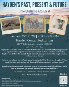 On the stage tonight at the Hayden Center is a storytelling contest: Hayden’s Past, Present & Future Storytelling Contest. It starts at 6 p.m. tonight, with stories about Hayden. You can win big prize money. Register at HaydenColorado.com
