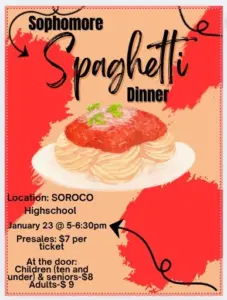 Tonight is the Sophomore Spaghetti Dinner at SoRoCo High School. It starts at 5 p.m. Presale tickets are $7 or $9 at the door tonight. Children ten and under and seniors are $8.