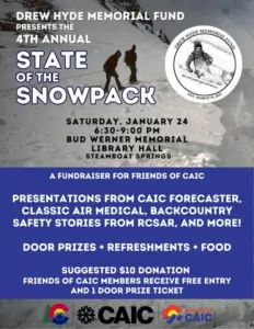 The 4th Annual State of the Snowpack event is at 6:30 p.m. Saturday, Jan. 24, at Bud Werner Memorial Library. It’s presented by for the Drew Hyde Memorial Fund, and a fundraiser for Friends of Colorado Avalanche Information Center. There is a suggested $10 donation at the door.