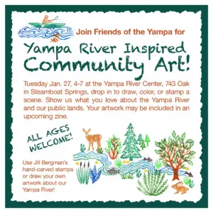 Friends of the Yampa is partnering with artist Jill Bergman to host Yampa River-themed community art nights, to celebrate the Yampa River and its public lands. The first one is from 4-7 p.m. Tuesday, Jan. 27, at the Yampa River Center, 743 Oak Street. It’s a drop-in event so stop by any time.