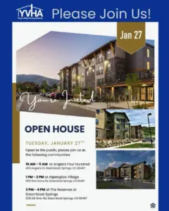 Yampa Valley Housing Authority is hosting three open houses today, to tour local communities. The first is from 10-11 a.m. at Anglers Four Hundred, which is 400 Anglers Drive. The second is 1-2 p.m. at Alpenglow Village at 1400 Pine Grove Road. The third is from 3-4 p.m. today at The Reserves at Steamboat Springs, which is 2100 Elk River Road.