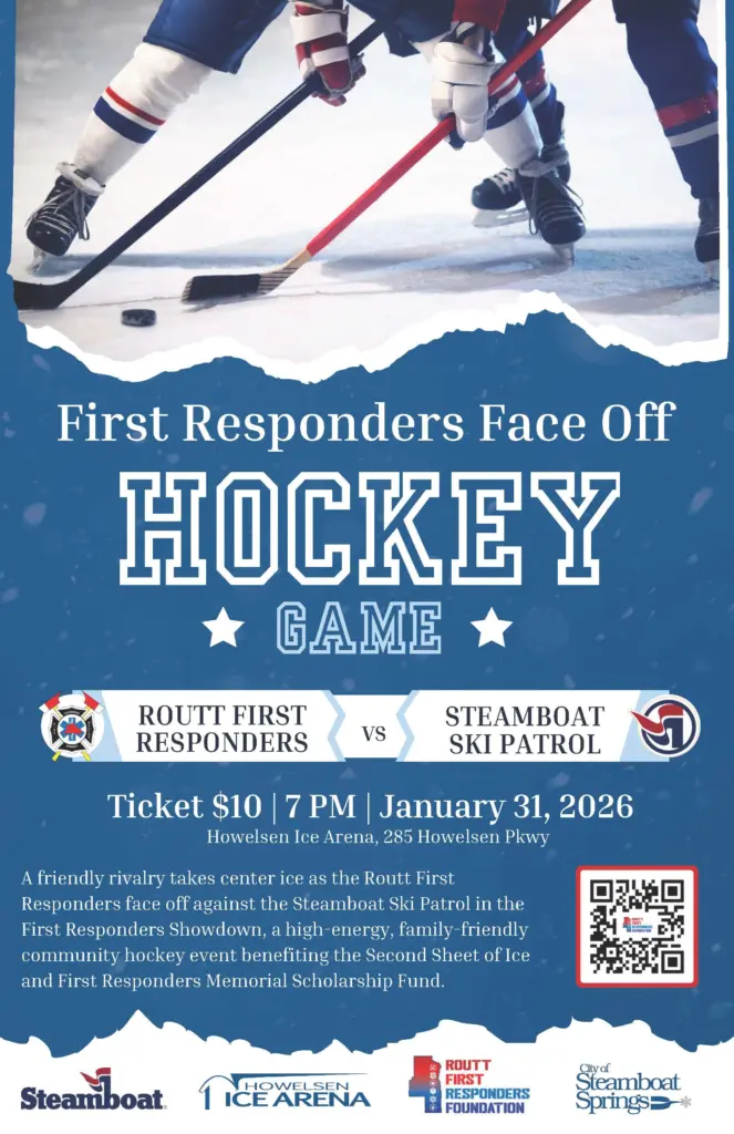 The big game is at 7 p.m. Saturday, Jan. 31, at Howelsen Ice Arena. Tickets are $10 for general admission. Money raised will help support a second sheet of ice at Howelsen Ice Arena and the Routt First Responders Foundation Memorial Scholarship. All money raised stays in the Yampa Valley. The QR Code below has more information.