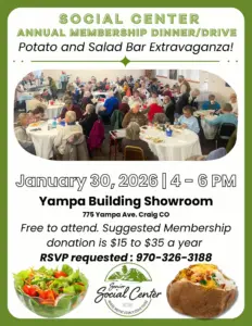 The Senior Social Center in Craig is hosting their annual Baked Potato & Salad Bar, from 4-6 p.m. today (Friday, Jan. 30). That’s at the Yampa Building. It’s free but donations are appreciated. Please give them a call to RSVP. 970-326-3188. They’re also hiring a Senior Social Center outreach coordinator, if you’re interested.