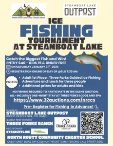 Steamboat Lake is hosting an Ice Fishing Tournament on Saturday, Jan. 31. Catch the biggest fish and win. It’s $40.Kids 15 and under are free. Questions? Reach out to North Routt Community Charter School at Office@NorthRouttCharter.org or call 970-871-6062.