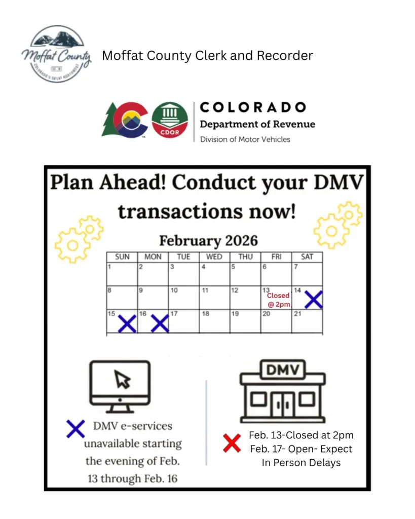 The Moffat County DMV office closes at 2 p.m. on Friday, Feb. 13, and will re-open Feb. 17, but they say to expect in-person delays.