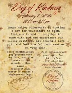 Yampa Valley Fiberworks is hosting a Day of Kindness, with a bonfire, with popcorn and hot cocoa, friendship bracelets, and lots of animals. It’s from 10 a.m. to 2 p.m. at Yampa Valley Fiberworks, 41180 N. Highway 13, north of Craig in Moffat County.