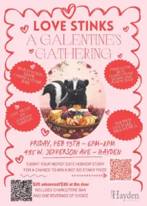A “Love Stinks,” Galentine’s Gathering is from 6-8 p.m. tonight (Friday, Feb. 13) at the Hayden Center in Hayden. It’s for those 18 and older. There’s a prize for the Worst Date Horror Story.