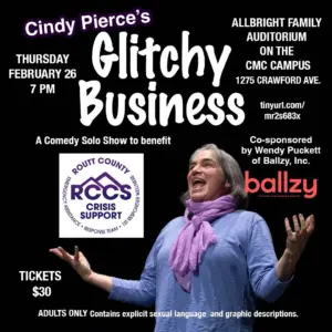 Comedian Cindy Pierce is performing at CMC in Steamboat Springs tonight. It’s a fun-filled evening of humorous stories. The show is called Glitchy Business. It is a benefit for Routt County Crisis Support. It starts at 7 p.m. Thursday, Feb. 26, at CMC. Link for Tickets