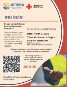Then on Wednesday, United Way of the Yampa Valley is offering Red Cross Shelter Training. It’s from 11 a.m. to 5 p.m. Wednesday, March, 4, at Bud Werner Memorial Library. This is training to help if there is an emergency in the community. Find out more at UnitedWayoftheYampaValley.org or call 970-879-5605.Register Here.
