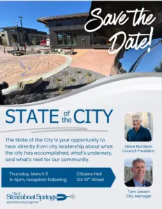 Today is the inaugural State of the City address in Steamboat Springs. City Council President Steve Muntean and City Manager Tom Leeson will provide updates on accomplishments and initiatives, and what’s ahead for Steamboat Springs. It’s at 5 p.m. today (Thursday, March 5), at Citizens Hall, 124 10th Street. A reception immediately follows the presentation.