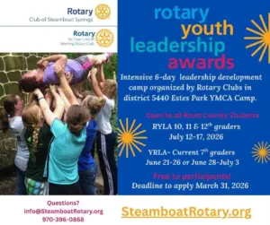 The Steamboat Springs Rotary Clubs are applications for Routt County students who want to go to Rocky Mountain Youth Leadership camps in Estes Park this summer. Camps are available for students in 10th, 11th, or 12th grades as well as current 7th graders. The deadline to apply is March 31. Apply at SteamboatRotary.org. For questions, email info@SteamboatRotary.org, or call 970-396-0868.