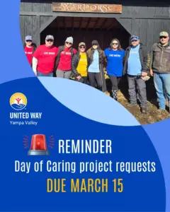 The United Way of the Yampa Valley Day of Caring is coming up May 20. But the deadline is this Sunday, March 15, if you want to be on the list to be a recipient for this year’s Day of Caring. This is for nonprofits, government, and low-income individuals in the community who would like some help with certain projects.  This is for this in Routt County and Moffat County.