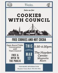 Tonight is Cookies with Council in the Town of Hayden. Join Hayden council members for a roundtable discussion at 5:30 p.m. in the Magnolia Room at The Hayden Center. It’s free, as are the cookies and hot cocoa.
