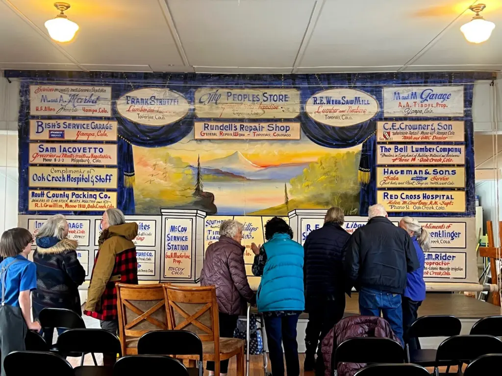 It’s full of old hand-painted advertisements from the late 1930s, of businesses mainly in Yampa and Oak Creek. It is estimated to be close to 100 years old. It had been taken down and rolled up, and stored under the old side benches in the basement.