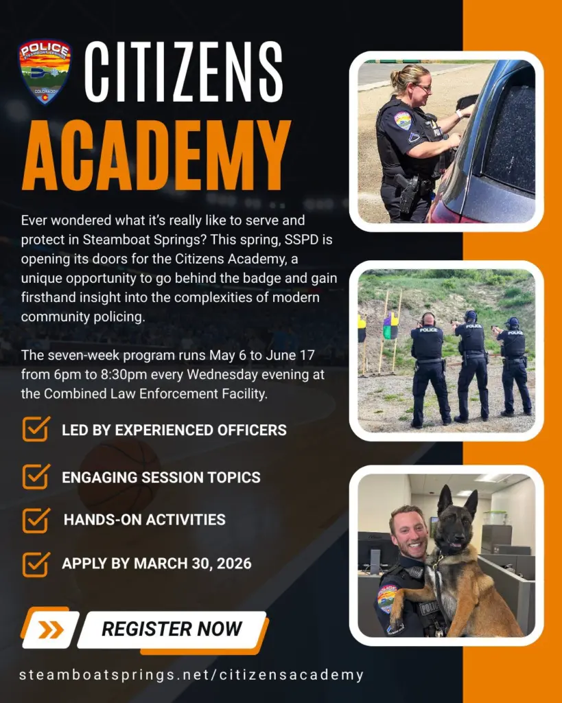 Applicants must be 21 or older, able to sit for two to three hours in a classroom setting, and willing to undergo a background check. This is an educational program—not a path to employment—but it’s a great way to learn, engage, and strengthen community ties with the Steamboat Springs Police Department.