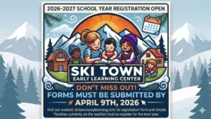 Thursday, April 9, at 7 a.m. is the deadline to register for the upcoming school year for the Ski Town Early Learning Center. This is for Infants through Pre-K. The Ski Town Early Learning Center is at 1647 Mid Valley Drive, and is formerly the Heritage Park Preschool. Registration is on a lottery system for new families.