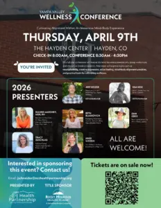The 14th annual Yampa Valley Wellness Conference is Thursday, April 9, at the Hayden Center. The conference features speakers and workshops with interactive breakout sessions. It’s presented by The Health Partnership. A link for tickets is on the Events Calendar on our website.