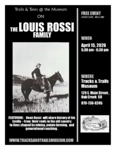 Trails & Tales at the Museum presents a presentation on The Louis Rossi Family, from Dean Rossi. Hear about the Rossi family’s roots in the old country that were shaped by mining, potato farming, and generational ranching. It’s at 5:30 p.m. Wednesday, April 15, at the Tracks & Trails Museum on Main Street in Oak Creek.