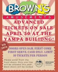 Advanced tickets to the Brown’s Amusement Park Carnival on Memorial Day weekend (May 21-25) in Craig go on sale at 9 a.m. this Thursday. Tickets go on sale at 9 a.m. in the Yampa Building. Please enter through the front doors. There’s a limit of ten tickets per person.
