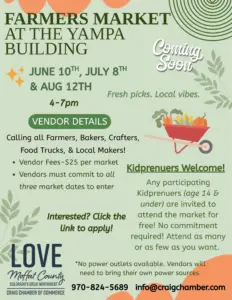 An inaugural Farmers Market at the Yampa Building in Craig is June 10, July 8, and Aug. 12. It’s from 4-7 p.m. on the second Wednesday of the month. Vendors are invited to sign up by emailing Info@CraigChamber.com